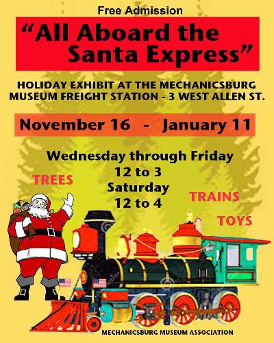 Looking for something do to during the holiday season? Gather the family and enjoy the Mechanicsburg Museum's newest exhibit, "All Aboard the Santa Express"! Come view our festive Christmas display of working model trains, themed Christmas trees, and toys for both young and old. The Museum is located at 2 West Strawberry Alley in Mechanicsburg. Hours are Wednesday through Friday 12 noon until 3:00 p.m. & Saturdays 12 noon until 4:00 p.m. Admission is free.