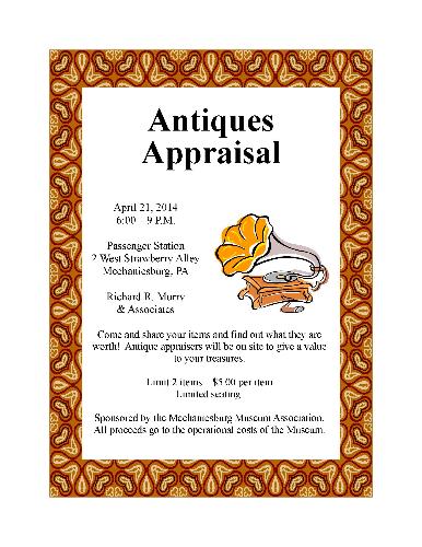 Come and share your items and find out what they are worth! Appraiser Richard R. Murry & Associates will be on site to give a value to your treasures. The is a limit of 2 items per person with a fee of $5.00 per item. Seating is limited. This event is sponsored by the Mechanicsburg Museum Association. all proceeds go to the operational costs of the Musuem.