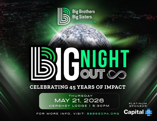 Join Big Brothers Big Sisters of South-Central PA on Thursday, May 21 for Big Night Out and celebrate 45 years of mentorship in our region! For 45 years, Big Brothers Big Sisters of South-Central PA has been working to empower youth to reach their full potential. This milestone celebration is a chance to come together, to share stories, and to recognize our supporters, volunteers, and partners who make the mission possible.