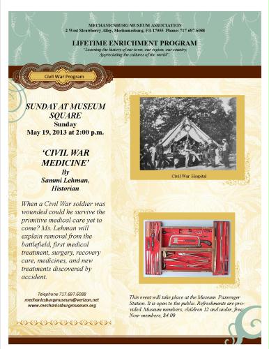 Historian Sammi Lehman will present a lecture on Civil War Medicine. When a Civil War soldier was wounded could he survive the primitive medical care yet to come? Ms. Lehman will explain removal from the battlefield, first medical treatment, surgery, recovery care, medicines, and new treatments discovered by accident.