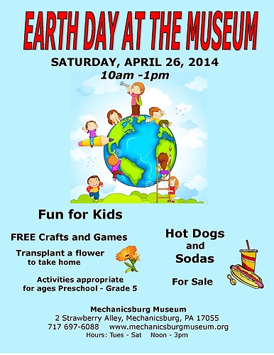 Come join in the fun of Mechanicsburg's Earth Day. The Mechanicsburg Museum will be holding events at the Passenger Station. Children's programs will include free crafts and games. They can also transplant a flower to take home. Activities appropriate for ages Preschool - Grade 5. Hot dogs and soda will be for sale on the patio. All events will take place from 10:00 a.m. until 1:00 p.m. See you there!