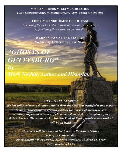 Meet Mark Nesbitt! Mark is a noted author and historian. He has collected over a thousand stories from the Civil War battlefields that appear to support the existence of spirit entities. He will use photographs and recordings to present evidence of ghosts and theories that attempt to explain their existence. His recent work, "The Big Book of Pennsylvania Ghost Stories" will be on hand.