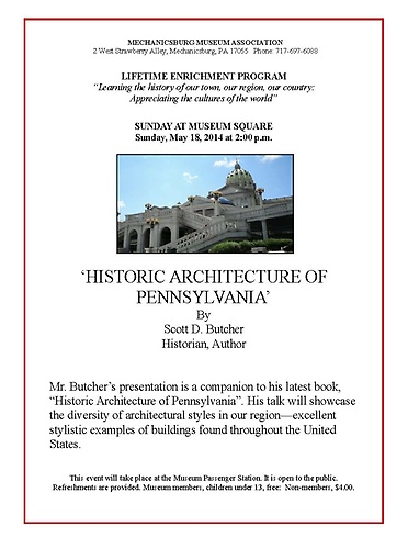 Join historian and author, Scott D. Butcher as he will showcase the diversity of architectural styles in our region which are excellent stylistic examples of buildings found throughout the United States. Mr. Butcher's presentation is a compaion to his latest book, "Historic Architecture of Pennsylvania".