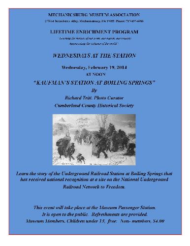 This lecture will be presented by Richard Tritt, Photo Curator for the Cumberland County Historical Society. The program will be held at the Passenger Station located at 2 W. Strawberry Alley, Mechanicsburg, PA on February 19, 2014 at 12:00 P.M.