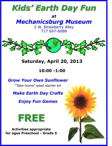 Bring the kids to celebrate Earth Day at the Mechanicsburg Museum. Children can make Earth Day Crafts, enjoy fun games & grown their own sunflower with a "take home" seed starter kit.