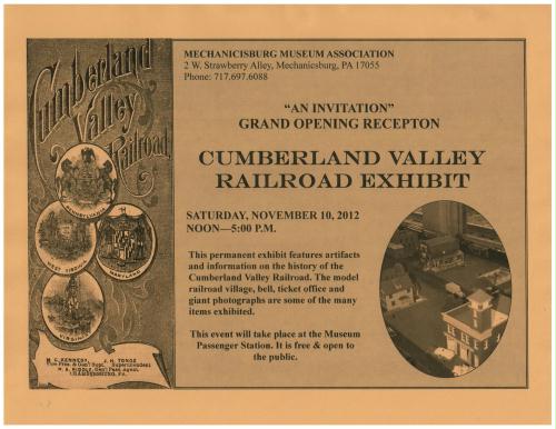 Please join us on Saturday, November 10th, 2012 from 12 Noon until 5:00 P.M. at the Passenger Station for the grand opening of the Cumberland Valley Rail Road Museum. This permanent exhibit will feature artifacts and information on the history of the Cumberland Valley Railroad. This event is free & open to the public