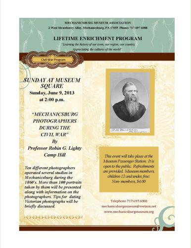 Join Professor Robin G. Lighty of Camp Hill as he presents ten different photographers who operated several studios in Mechanicsburg during the 1860's. More than 100 portraits taken by them will be presented along with information on the photographers. Tips for dating Victorian photographs will be briefly discussed.