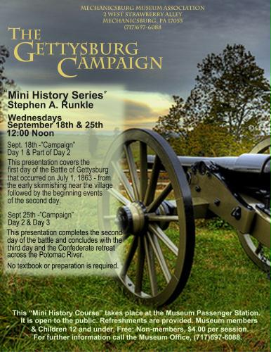 This "Mini History Course" takes place at the Museum Passenger Station. It is open to the public. Refreshments are provided. Museum members and children 12 and under, Free; Non-members, $4.00 per session. For further information or to pre-register please call the Museum Office, 717-697-6088.