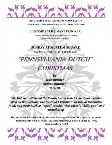 Join us at the Passenger Station for a "Pennsylvania Dutch" Christmas" lecture presented by author & historian, Scott Butcher. Mr. Butcher will detail the Pennsylvania Dutch Christmas customs such as Belsnickling, the "Second Christmas" as well as traditional foods and treats such as "apee" cookies, "leb-cakes", "belly-guts" and metzel soup.