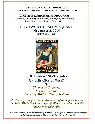 Join us at the Mechanicsburg Museum's Passenger Station as Thomas W. Sweeney, Former Director of the U.S. Army Military History Institute, will present his lecture. Mr. Sweeney will give a general overview of the major alliances that led to World War I, the scope of military operations, and the impact on world affairs.