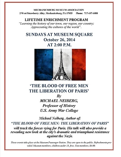 Join us at the Mechanicsburg Museum Association's Passenger Station as Michael Neiberg, Professor of History at the U.S. Army War College, presents his lecture on the forces vying for Paris. His talk will also provide a revealing new look at the city's dramatic and triumphant resistance against the Nazis.