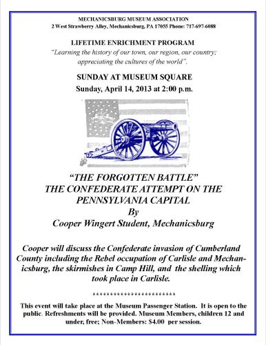 Join us for an insightful lecture presented by student Cooper Wingert. He will discuss the Confederate invasion of Cumberland County including the Rebel occupation of Carlisle and Mechanicsburg, the skirmishes in Camp Hill, and the shelling which took place in Carlisle.