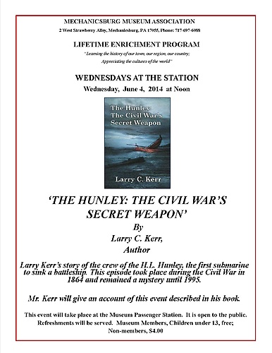 Join author Larry Kerr as he tells the story of the crew of the H.L. Hunley, the first submarine to sink a battleship. This episode took place during the Civil War in 1864 and remained a mystery until 1995.