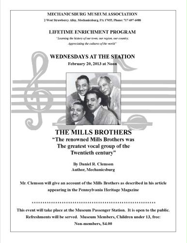 Join us for an interesting and informative program on The Mills Brothers presented by Mechanicsburg author, Daniel R. Clemson. Mr. Clemson will present an account of the Mills Brothers as described in his article appearing in the Pennsylvania Heritage Magazine. "The renowned Mills Brothers was the greatest vocal group of the Twentieth century."