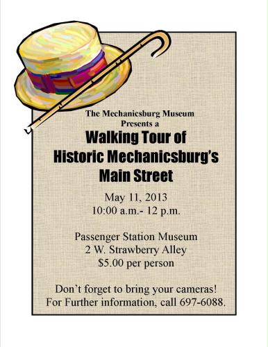 Lace up your walking shoes and join us for an informative and entertaining walking tour of Historic Mechanicsburg's Main Street. The group will meet at the Museum's Passenger Station. There is a $5.00 per person fee. Don't forget to bring your cameras!