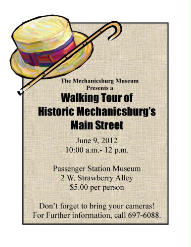 The Mechanicsburg Museum presents a Walking Tour of Historic Mechanicsburg's Main Street on June 9, 2012. The Tour begins at 10:00 a.m. at the Passenger Station Museum located at 2 W. Strawberry Alley. Cost is $5.00 per person. Don't forget to bring your cameras!